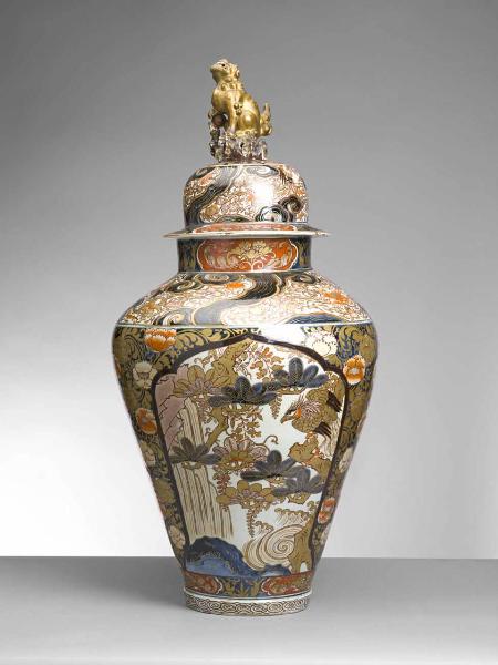 Grande vaso a sezione circolare con spalla bombata, collo cilindrico e coperchio a calotta sormontato da presa a forma di "leone cinese" (karashishi) a tutto tondo. La decorazione, dipinta a smalti blu, nero e rosso, ai quali si aggiungono diffuse stesure di oro (applicato al di sopra dell'invetriatura trasparente) si compone di un tappeto di motivi geometrici e floreali, sul quale sono riservate, nella zona compresa tra la base e l'attacco della spalla, grandi cartigli dal contorno lobato, all'interno di ognuno dei quali è una scena con un rapace, i rami di un albero di pino (matsu), rocce e i flutti di una cascata (nachi).