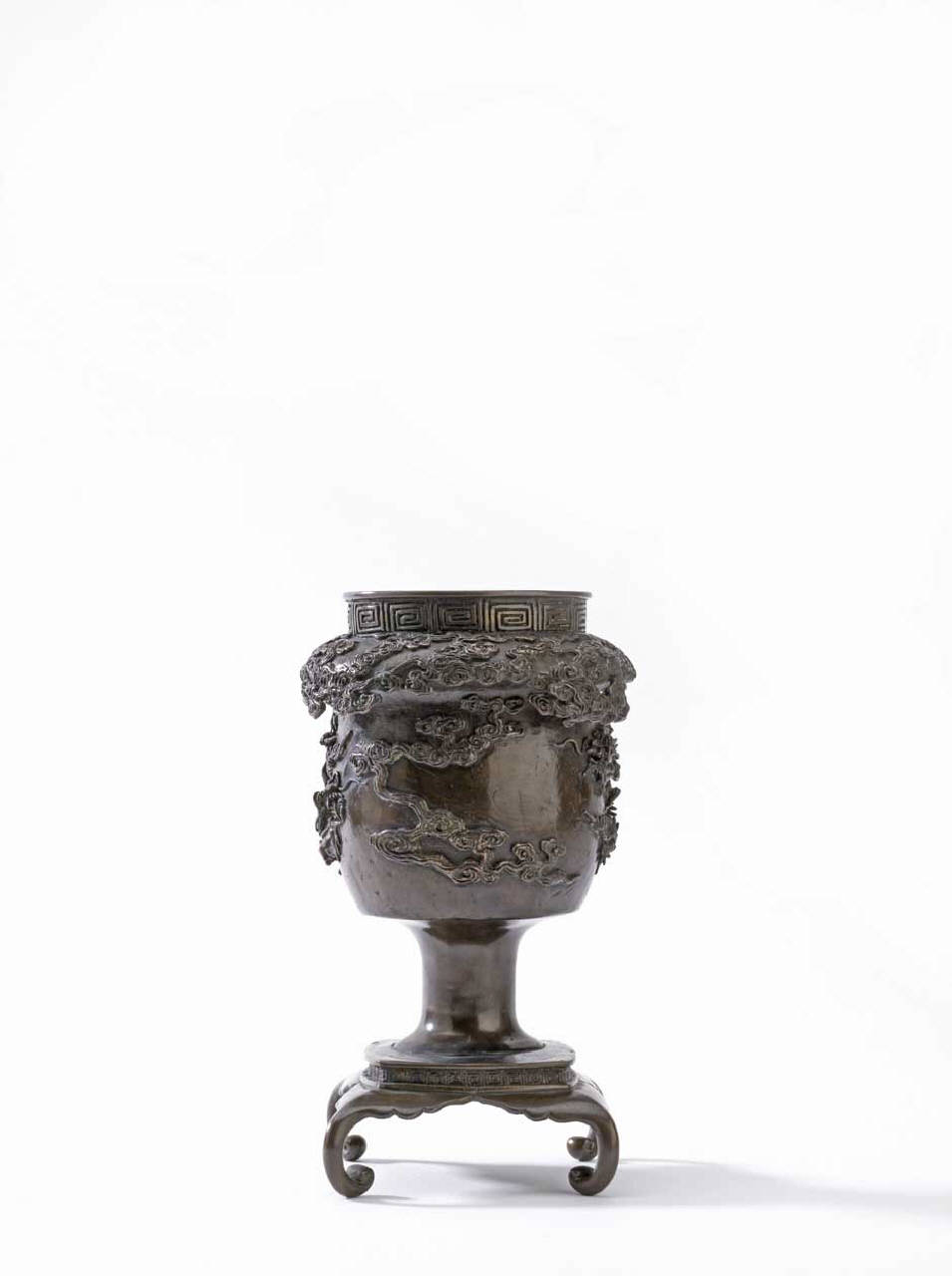 Vaso da fiori (usubata) realizzato con la tecnica a fusione con stampo (chukin). Si costituisce di due pezzi assemblabili: uno superiore a forma di calice, con orlo superiore decorato con un meandro di greca (raimon) e corpo sul quale si vedono draghi (ryu) e nuvole (kumo); uno inferiore con corpo cilindrico che si incastra su uno stelo. Il tutto poggia su una base rotonda con quattro piedi ricurvi sagomati.