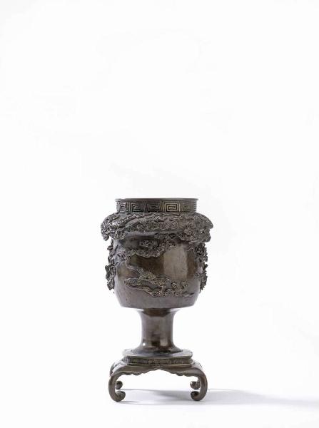 - NOTIZIE STORICO CRITICHE Questo tipo di vaso da fiori (usubata) era utilizzato per la cerimonia dei fiori (kado o ikebana). La firma incisa fa riferimento alla bottega di Murata Seimin (Nagasaki 1761-1837), il quale si impose per la grande cura dei dettagli e il realismo delle raffigurazioni, realizzate con la tecnica degli stampi in cera (rogata-imono). L'opera sembra comunque databile alla seconda metà del XIX secolo: è noto infatti che in epoca Meiji (1868-1912) in molte fonderie giapponesi si contraffacesse la firma del famoso artista nella speranza di vendite migliori.