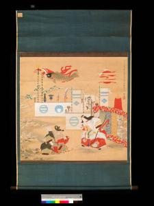 Il dipinto, nel formato del rotolo verticale da appendere (kakemono), è dipinto a inchiostro e colori su seta. La scena raffigurata si svolge essenzialmente su due registri. In alto sono raffigurati alcuni degli emblemi che meglio caratterizzano la Festa dei Bambini (Kodomo no hi) che si festeggia ancora oggi il 5 maggio, ovvero le bandiere a forma di carpa (koinobori), un dipinto raffigurante Shoki, alcune armi in asta, cortine con emblemi araldici (mon) di vario tipo. In basso, invece, si vede una scena con un incontro tra una dama e un vecchio signore con in braccio un bambino. Ha cornice tradizionale in seta con bacchette in legno.
