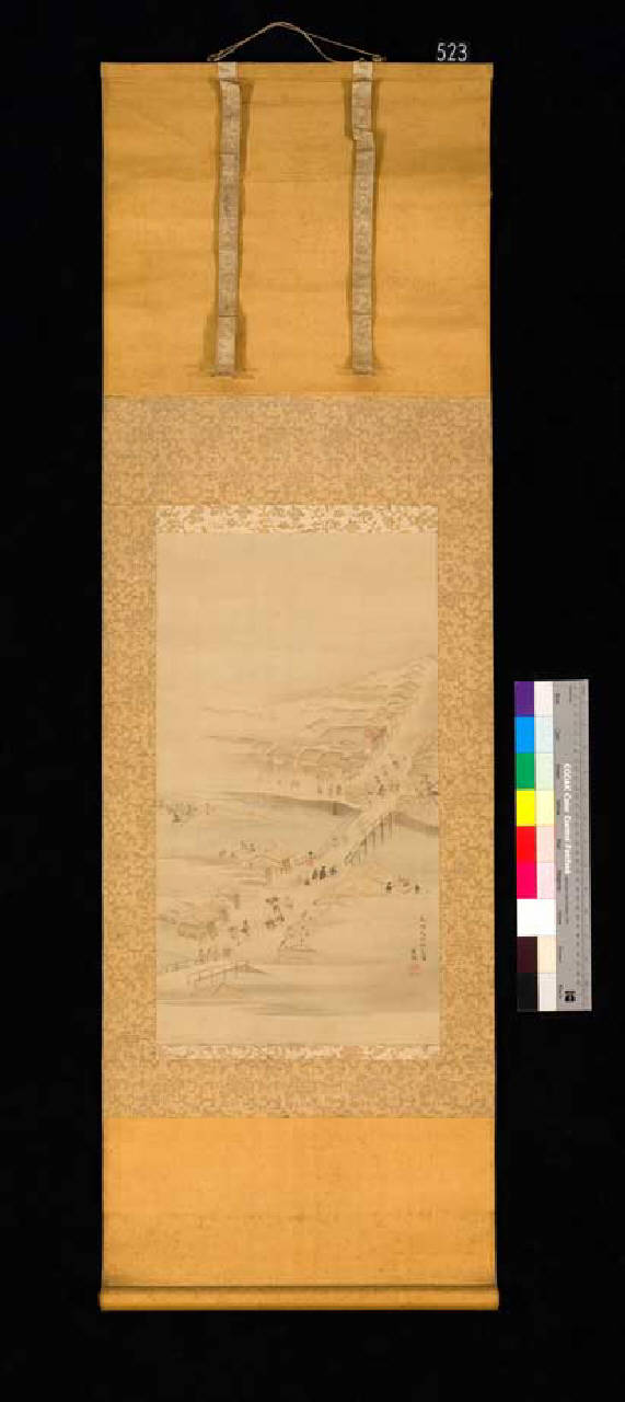 Il dipinto, nel formato del rotolo verticale da appendere (kakemono), è stato realizzato a inchiostro e colori tenui su seta. Raffigura uno scorcio di paesaggio urbano, con una serie di basse abitazioni attraversate da un ponte sul quale camminano molte persone. L'atmosfera è brumosa, come se si trattasse di un mattino presto in una giornata d'inverno. Ha tradizionale cornice in seta con bacchette in legno.