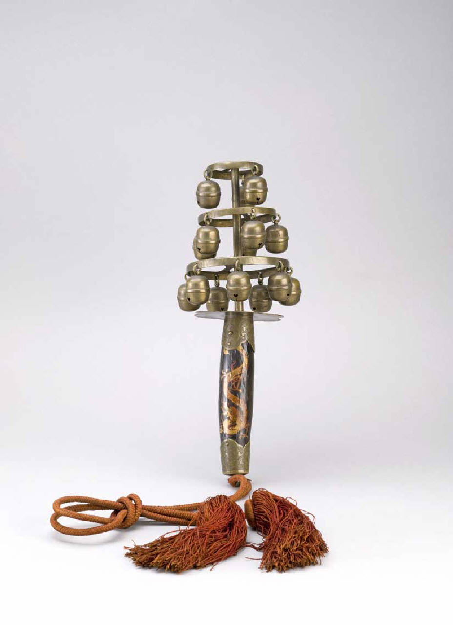 Sonagliera (suzu) con manico in legno laccato decorato con un drago (ryu) dorato; dal manico si dipanano tre anelli in bronzo di dimensioni decrescenti, ai quali sono agganciati diciassette campanelli (tre, cinque, nove) anch'essi in bronzo. All'altra estremità del manico è un foro in cui si inserisce un cordoncino con fiocco in seta.