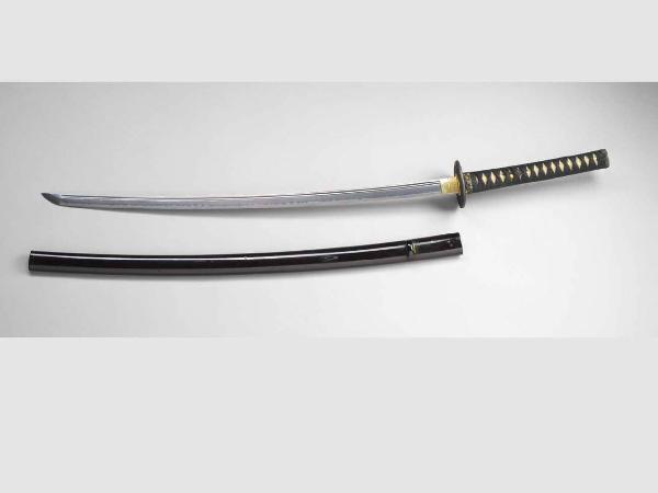 Katana. La lama ha curvatura di tipo toriizori (centro della curva verso la metà della lama), punta di tipo chu-kissaki, hamon di profilo irregolare, sgusci paralleli di tipo futatsuji-bi. Il fodero (saya) è in legno laccato di nero omogeneo E' presente l'anello per il cordone. L'impugnatura (tsuki) è rivestita di pelle di pesce (saya) su cui si svolge un intreccio di tessuto(ito-tsuki). Rondelle (seppa) e manicotto (habaki) sono in metallo dorato, parzialmente lavorato a incisione. Fuchi (ghiera ornamentale) e kashira (cappuccio superiore dell'impugnatura) sono in shakudo (lega di rame e oro) lavorato nanako (punteggiatura superficiale), decorate in alto rilievo (takabori) e parzialmente dorate con motivi di pini (matsu) e susini (ume). Anche il menuki raffigura un albero di pino. Il manicotto (habaki) è in ottone dorato con incisioni di linee oblique parallele. Tsuba (guardamano) di forma quadrata con angoli e lati arrotondati (nadekaku), realizzata in shakudo (lega di rame e oro) lavorato nanako (punteggiatura superficiale), decorate in alto rilievo (takabori) e parzialmente dorate con motivi di pini (matsu) e susini (ume) con disco lunare.
