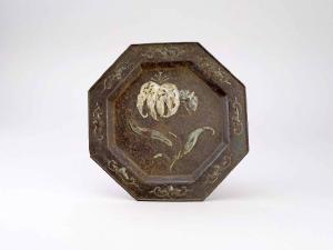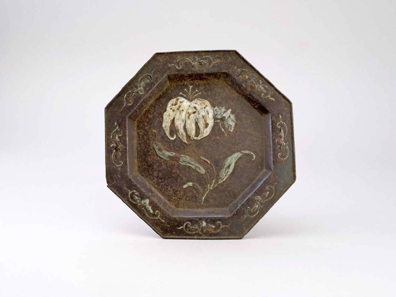 Piatto di forma ottagonale in ferro ornato con smalto policromo a fiori.