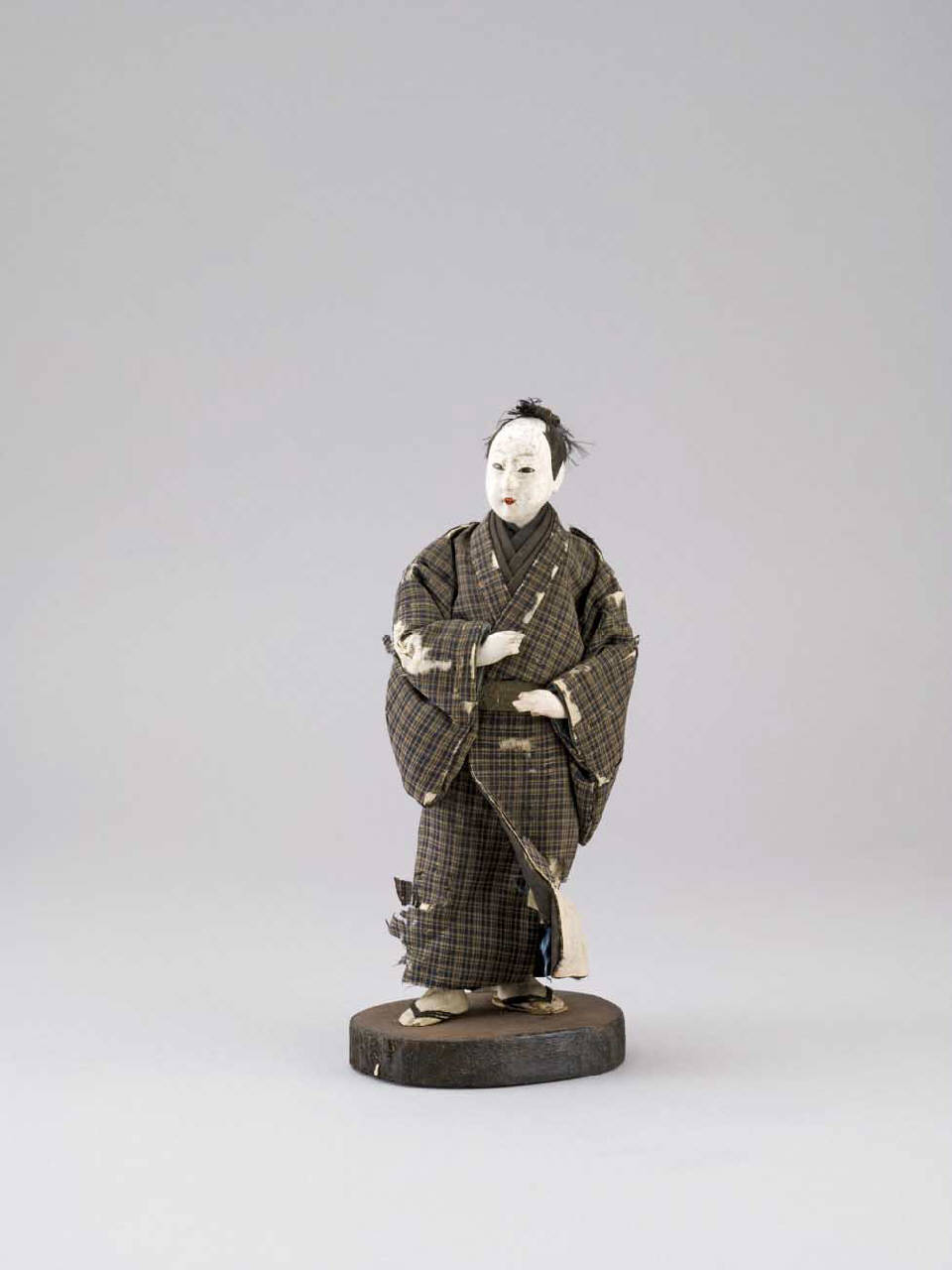 Bambola con testa e mani di legno e gesso, occhi e bocca dipinti, abito in seta è posta su un piedistallo ovale. Raffigura una donna con abito scuro. Si intravedono gli abiti interni.