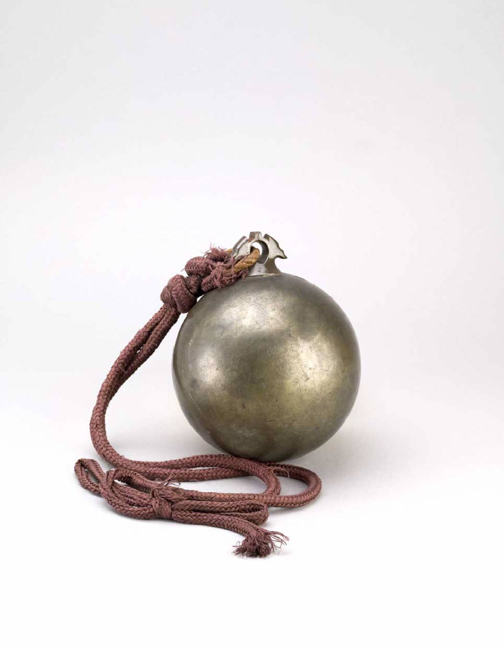Sfera in bronzo con anello, al quale si lega un cordoncino in seta rossa.