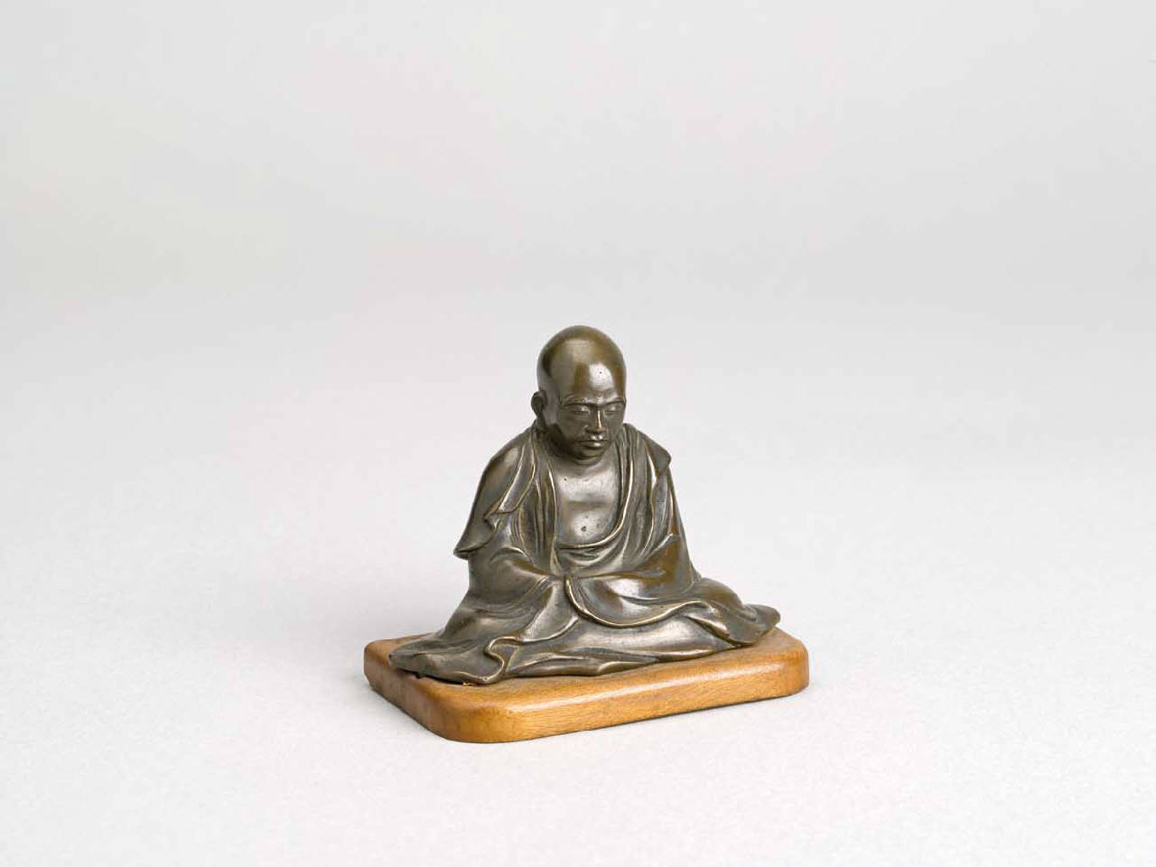 Scultura in bronzo raffigurante uno dei Judaideshi, ovvero i "Dieci grandi discepoli del Buddha". Base in legno.