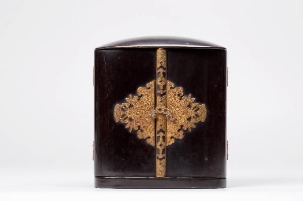 Tempietto portatile (zushi) in legno laccato, di nero sull'esterno e di oro all'interno. I due sportelli sono dotati di serratura e placche in metallo dorato e inciso con motivi floreali. All'interno, nella teca, sormontata da fregio a contorno ogivale dipinto in policromia con fiori di loto, sono ubicate tre sculture di divinità buddhiste, ognuna delle quali posante su propria base a forma di fiore di loto, tutte sistemate su piedistallo a più livelli. Al centro si riconosce Kannon (in sanscrito Avalokitesvara), bodhisattva della compassione; alla sua destra, sul davanti, il Buddha Amida; sulla sinistra un altro bodhisattva, di difficile identificazione. All'interno di un'anta, su fondo oro, è un'immagine con due offerenti, un uomo e una donna, seduti su rocce che emergono da onde marine. Sull'altra anta si vede, invece, un monaco, anch'egli seduto su roccia tra onde del mare: ha nella mano destra il vajra (in giapponese kongo), la "folgore", attributo tipico del buddhismo. Entrambe le raffigurazioni sono state realizzate su carta dipinta a tempera e quindi incollate sulle ante.