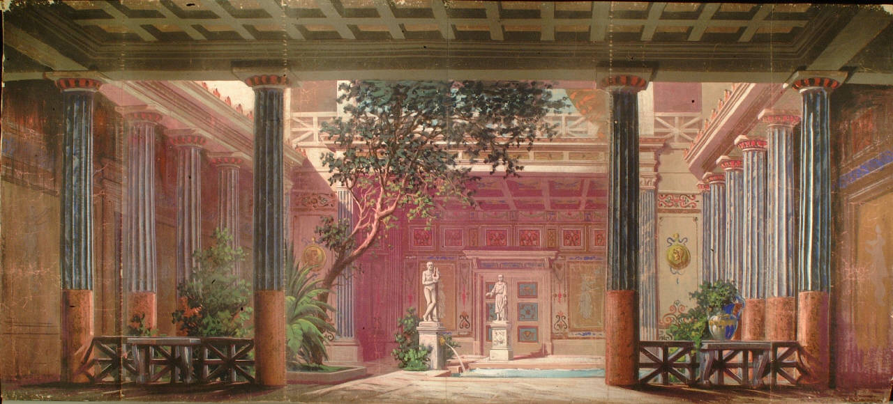 Scenografia in carta, fortezzata con strisce di tessuto di cotone, dipinta ad acqua e composta da un solo fondale.