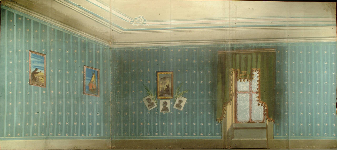 Scenografia in carta, fortezzata con strisce di tessuto di cotone, dipinta ad acqua e composta da un solo fondale.