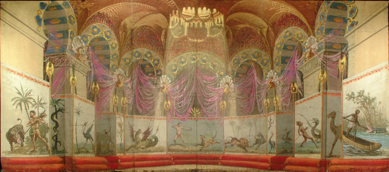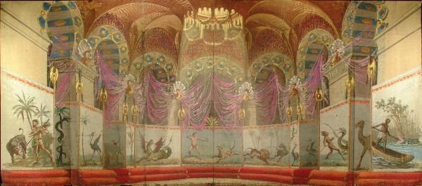 Scenografia in carta, fortezzata col strisce di tessuto di cotone, dipinta ad acqua e composta da un solo fondale.