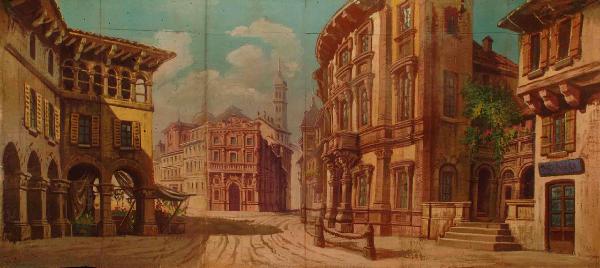 Scenografia in carta dipinta ad acqua e fortezzata con strisce di tela, composta da un fondale