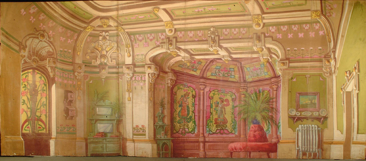 Scenografia in carta, fortezzata con strisce di tessuto di cotone, dipinta ad acqua e composta da un solo fondale che prevede una trasparenza dipinta per rendere fluorescente la vetrata raffigurata.
