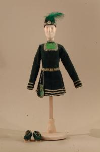 Costume per apricorteo di foggia rinascimentale composto da veste, cintura con borsetta, cappello e scarpe