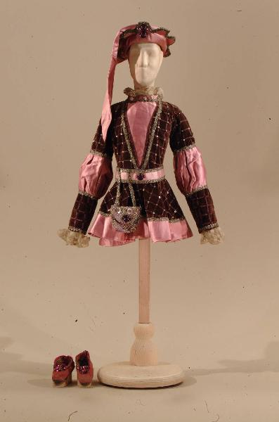 Costume per nobile di foggia rinascimentale composto da veste, scarpe, cintura e cappello