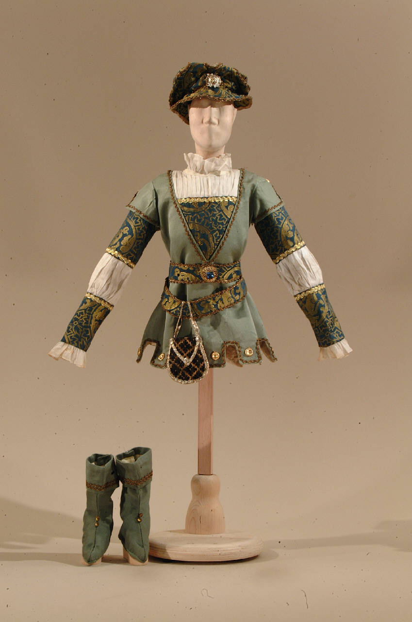 Costume per nobile di foggia rinascimentale composto da veste, scarpe, cintura e cappello
