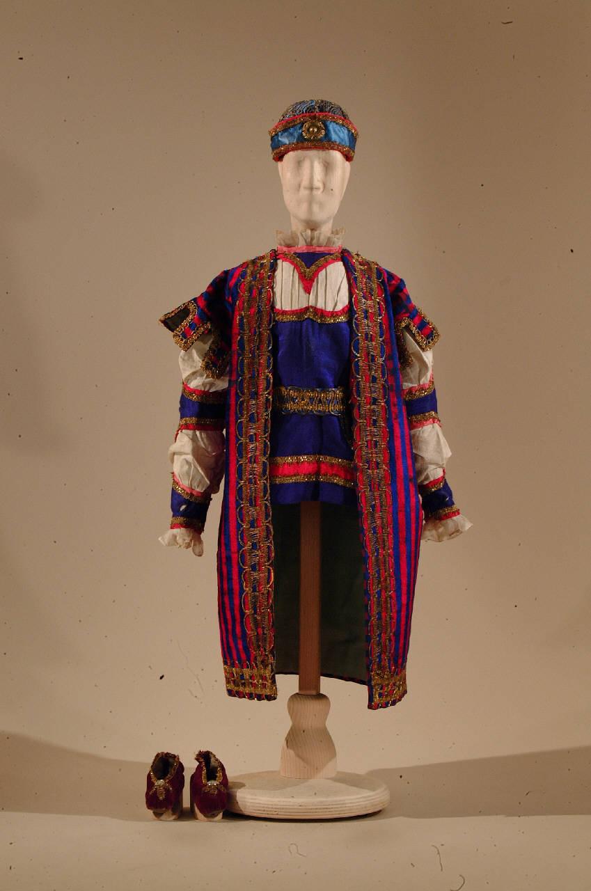 Costume per cavaliere di foggia rinascimentale composto da veste, sopravveste, cintura con portaspada, cappello e scarpe