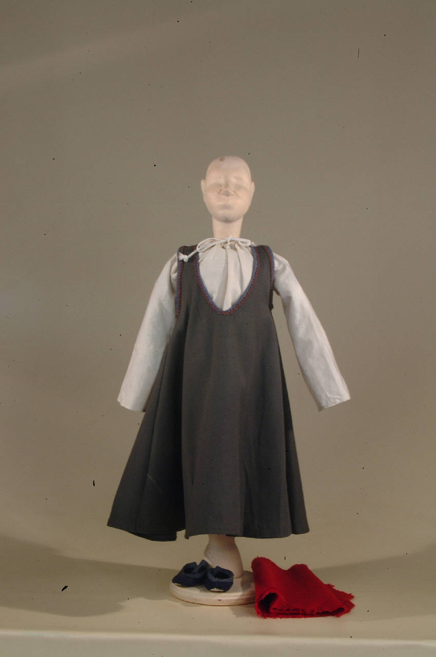 Costume di bambino mendicante del '400 costituito da veste, camicia, scarpe, panno rosso (usato come attrezzeria)
