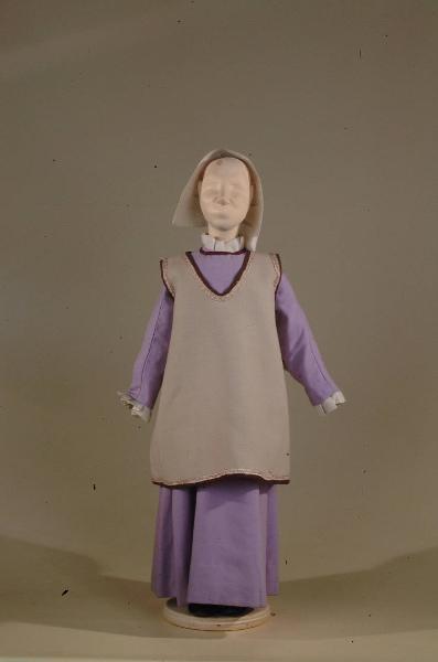 Costume di bambino popolana del '400 costituito da veste, sopravveste, scarpe, cuffia