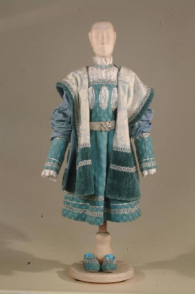 Costume per gentiluomo del '400 costituito da veste, sopravveste, cintura, scarpe