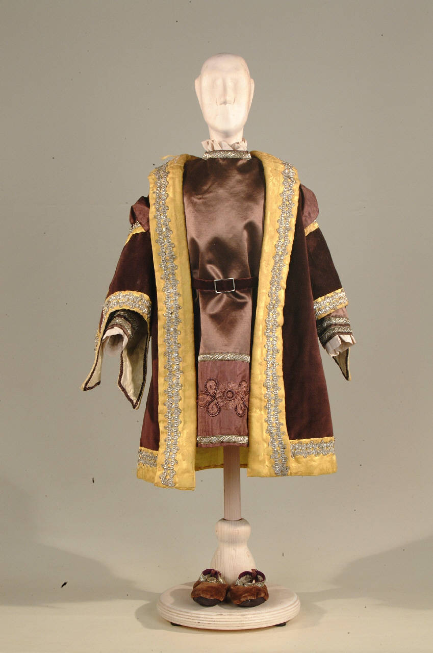 Costume per gentiluomo del '400 costituito da veste, sopravveste, cintura, scarpe