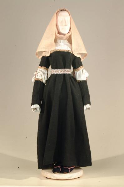 Costume per popolana del '400 costituito da veste, scarpe, cintura, velo, soggolo
