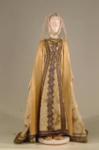 Costume per gentildonna del '400 costituito da veste, mantello, scarpe, velo, soggolo