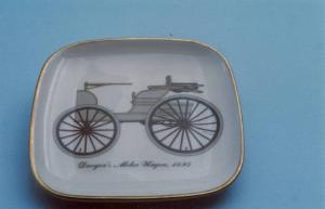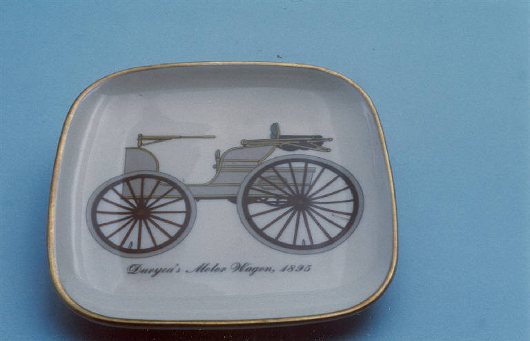 Posacenere di forma quadrata; fondo bianco con carrozza policroma al centro; angoli arrotondati; bordo rifinito con filettatura oro.