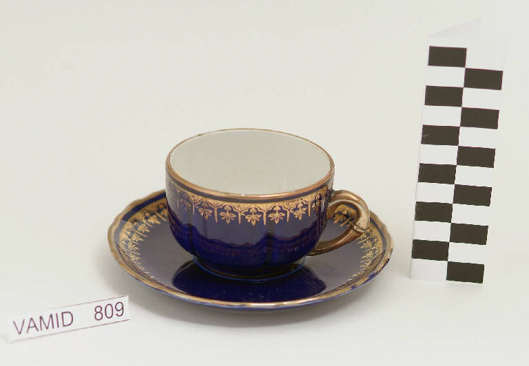 Tazza da thè decorata a motivi geometrici in oro brillante lungo i bordi, su sfondo blu cobalto; bianco internamente. Il manico è interamente dorato, in oro opaco "lumeggiato". Piattino con orlo ondulato decorato a motivi geometrici in oro brillante lungo il bordo, su fondo blu cobalto.