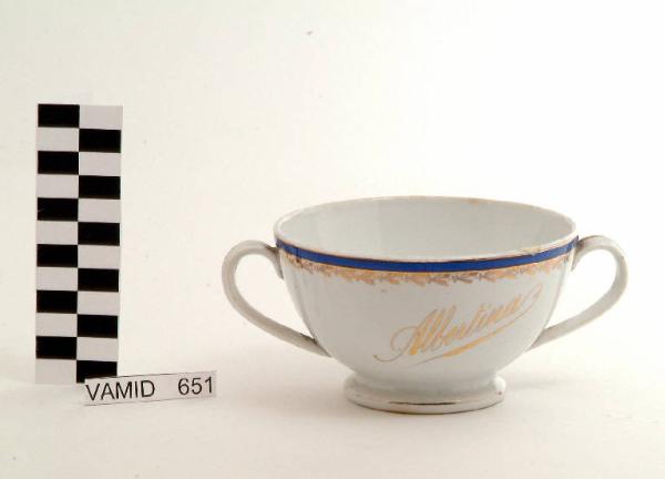 Ciotola con piede circolare; due manici a "C"; fondo bianco decorato con motivo vegetale stilizzato. Nome "Albertina" e rifiniture in oro.