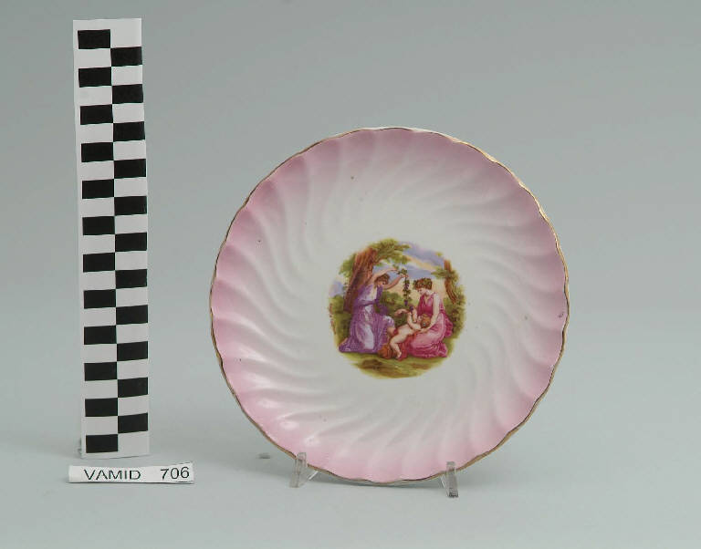 Piatto con orlo leggermente ondulato decorato con decalcomanie litografiche applicate sopra smalto a mezza altezza su sfondo rosa sfumato; bordo rifnito con filettatura oro.