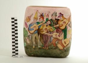 Vaso dalla forma schiacciata; fondo bianco decorato con festa popolare policroma all'esterno.