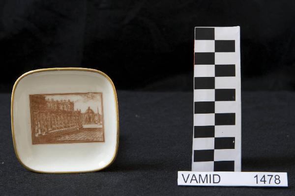 - NOTIZIE STORICO CRITICHE L'oggetto in esame, realizzato per la ICAT di Torino, è riferibile ad una produzione di metà Novecento che ha ormai assimilato la lezione del funzionalismo. La forma quadrata, arrotondata negli angoli, sobria ed elegante denota una ricerca stilistica. La veduta fantastica di una piazza rinascimentale, in monocromo color bruno, è stata realizzata con la tecnica della decalcomania. La ditta produttrice, denominata "Società Ceramica del Verbano", venne fondata nel 1924 per competere con la porcellana di Doccia. Malgrado la qualità materica e formale dei suoi servizi, la "Verbano", non ebbe mai sul mercato della porcellana la potenza della Ginori. Nel museo di Laveno sono conservati altri pezzi simili (nn. inv. 1472-1473, 1475-1486, 1506-1508, 1668 e altri).