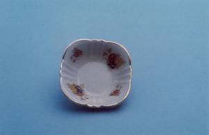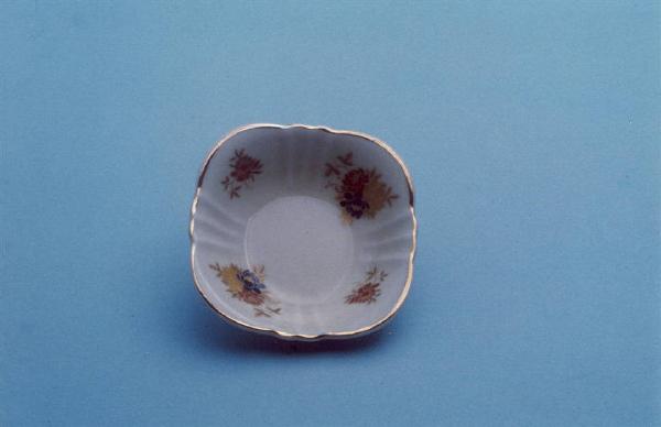 Posacenere con orlo leggermente ondulato; fondo bianco con motivo floreale stilizzato in giallo, rosso e blu all'interno; bordo rifinito con filettatura oro.