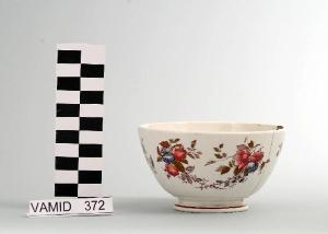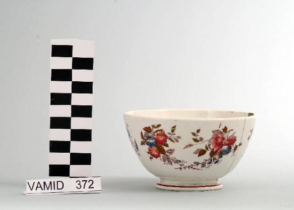 Ciotola con piede circolare; fondo bianco decorato con motivo floreale in marrone rifinito a mano in azzurro, rosa e verde.