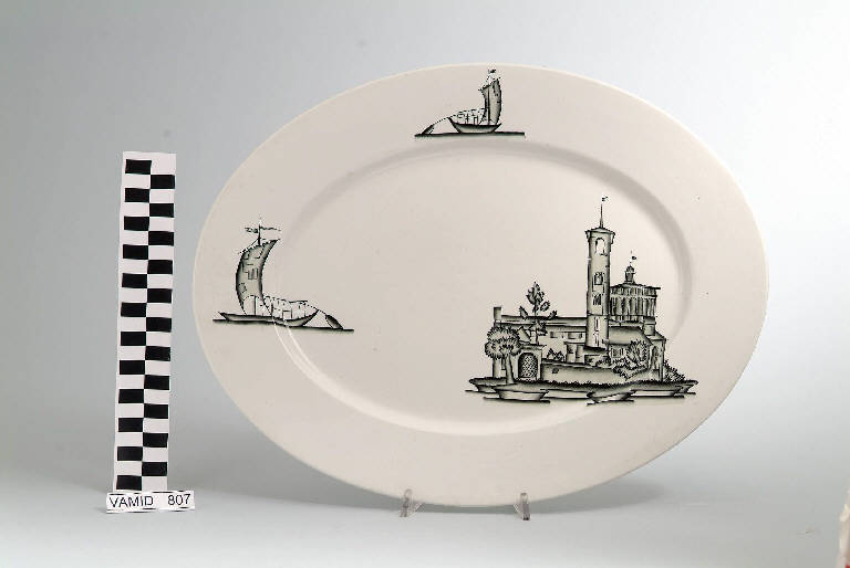 Piatto da portata ovale di colore bianco decorato con tre scorci lacustri nelle variazioni del grigio e del nero.