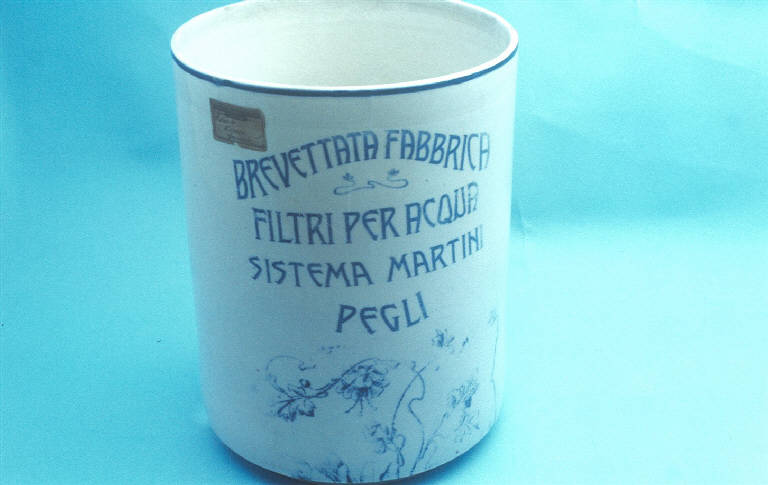 Contenitore cilindrico; fondo bianco decorato con motivi floreali e scritta "BREVETTATA FABBRICA/ FILTRI PER ACQUA/ SISTEMA MARTINI/ PEGLI" in nero.