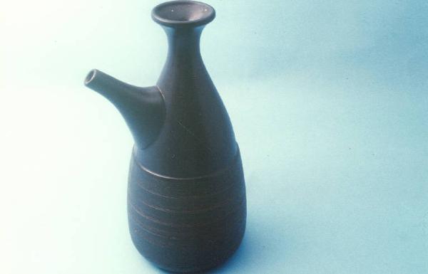 Brocca priva di anse con beccuccio sporgente e bordo dell'imboccatura estroflesso; fondo marrone scuro opaco con motivo filettato nella parte inferiore.