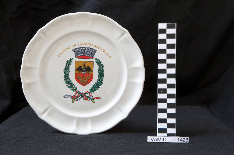 - NOTIZIE STORICO CRITICHE L'oggetto in esame, prodotto nel 1987 dalla Richard Ginori, ricorda il sessantesimo anniversario della fondazione del comune di Laveno Mombello istituito il 19 dicembre 1927 dall'accorpamento delle comunità di Cerro Lago Maggiore, Mombello Lago Maggiore e Laveno. Il piatto fu realizzato in terraglia dura con la forma cosiddetta "Vecchia Milano" e decorato da uno stemma eseguito con la tecnica della decalcomania. Nel Museo di Laveno è presente un altro piatto identico (num. inv. 1415).
