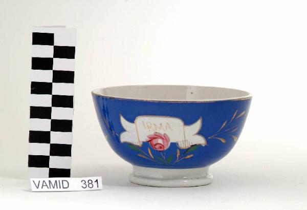 Ciotola con piede pronunciato, smaltata in blu sul corpo all'esterno ma non sul piede e all'interno, lasciati in bianco; campitura frontale 'risparmiata' in bianco a forma di cartiglio con scritta "IRMA"; cartiglio delineato in oro brillante e arricchito da una rosa dipinta a mano in smalto rosso; sul fondo blu vi è una decorazione a tralcio di foglie ondulato dipinta a mano soprasmalto in verde e sottosmalto in oro brillante. Rifinitura in oro brillante lungo l'orlo superiore.