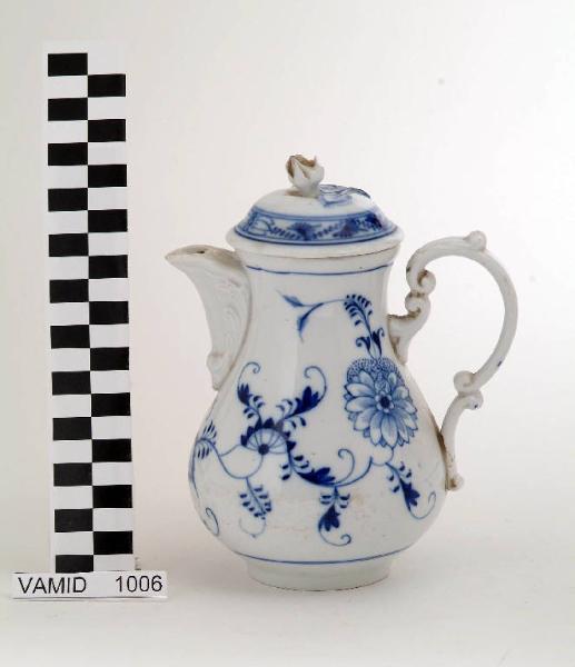 Teiera con corpo panciuto, beccuccio applicato, manico formato da tre volute contrapposte, coperchio con chiusura a incastro sormontato da una rosellina apicale che funge da pomolo; fondo bianco con fine decoro in blu cobalto a racemi e fiori stilizzati di sapore orientale sul corpo; coperchio con fascia decorativa a perlinatura e fiori.