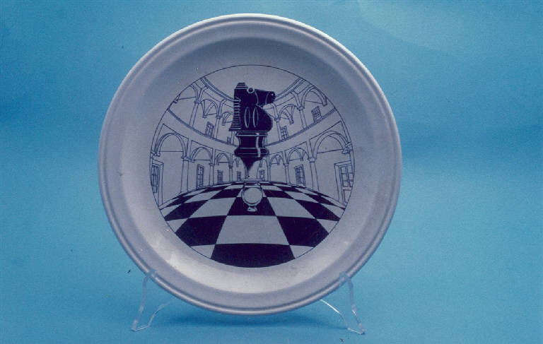 Piatto piano con piccola tesa solcata lungo il perimetro da una scanalatura. Decoro con una veduta del Palazzo perabò a cerro e un cavallo del gioco degli scacchi.