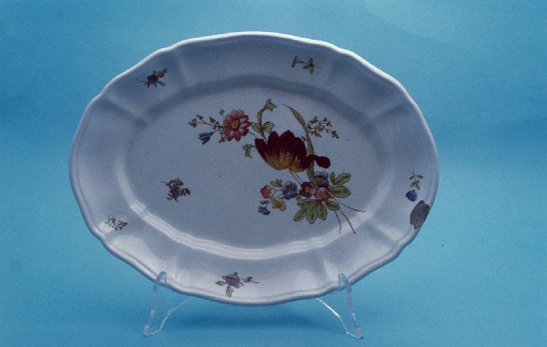 Piatto da portata ovale con tesa leggermente ondulata; fondo bianco decorato con motivo floreale dipinti a mano lungo il bordo e al centro. Profili molto stilizzati realizzati a china color seppia. Colori usati: viola, giallo, azzurro, blu rosa per i fiori e verde per le foglie.