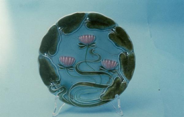 Piattino in terraglia a rilievo con bordo sagomato; decoro a motivi vegetali (foglie e ninfee); colore sottosmalto (rosa, verde, azzurro acquamarina).