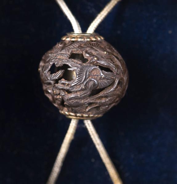 Intagliato a giorno, raffigura un gruppo di gru (tsuru); i due estremi sono bordati da anelli dentellati in metallo dorato.