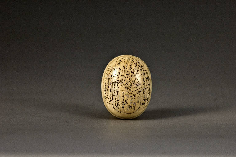 Netsuke di tipo manju, decorato su entrambi i lati con dodici cartigli di forma rettangolare, a ventaglio o polilobata, all'interno di ognuno dei quali è iscritta a inchiostro (sumi) una poesia dedicata ad un mese dell'anno.
