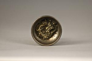 Netsuke in metallo parzialmente dorato a forma di coppa con funzione di posacenere (suigaraake). All'interno, nel fondo, è raffigurato un drago (ryu o tatsu) in accentuato rilievo.