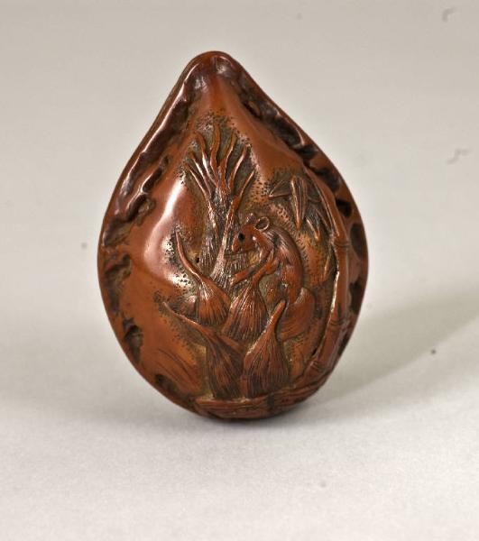 Il netsuke, intagliato sull'esterno del guscio di una noce (kurumi), raffigura una lepre (usagi) e uno scoiattolo (risu) tra la vegetazione; gli occhi dei due animali sono intarsi in corno. I due fori dell'himotoshi sono ubicati su un lato della noce.