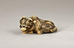 - NOTIZIE STORICO CRITICHE Lo stile che caratterizza questo netsuke è affine a quello di Tomotada (artista citato nel Soken kisho di Inaba Tsuryu (1781), famoso proprio per i suoi netsuke raffiguranti buoi sdraiati; tale era la sua popolarità che, mentre ancora era in vita, circolavano numerose copie firmate delle sue opere (Bushell 1971, pp. 20-22). Nonostante la proliferazione di falsi, opere considerate autentiche di Tomotada raffiguranti buoi sono conservate in molte collezioni sia private sia pubbliche.