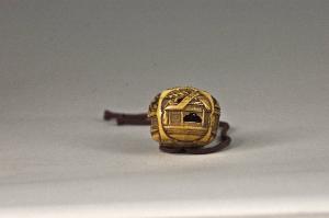 Netsuke di tipo ryusa-manju raffigurante uno scorcio di paesaggio con padiglioni in primo piano, suddiviso in quattro sezioni separate da altrettante fasce che percorrono verticalmente l'intero pezzo. Il laccio (himo) si inserisce nel foro situato nella porzione asportabile posta in alto.